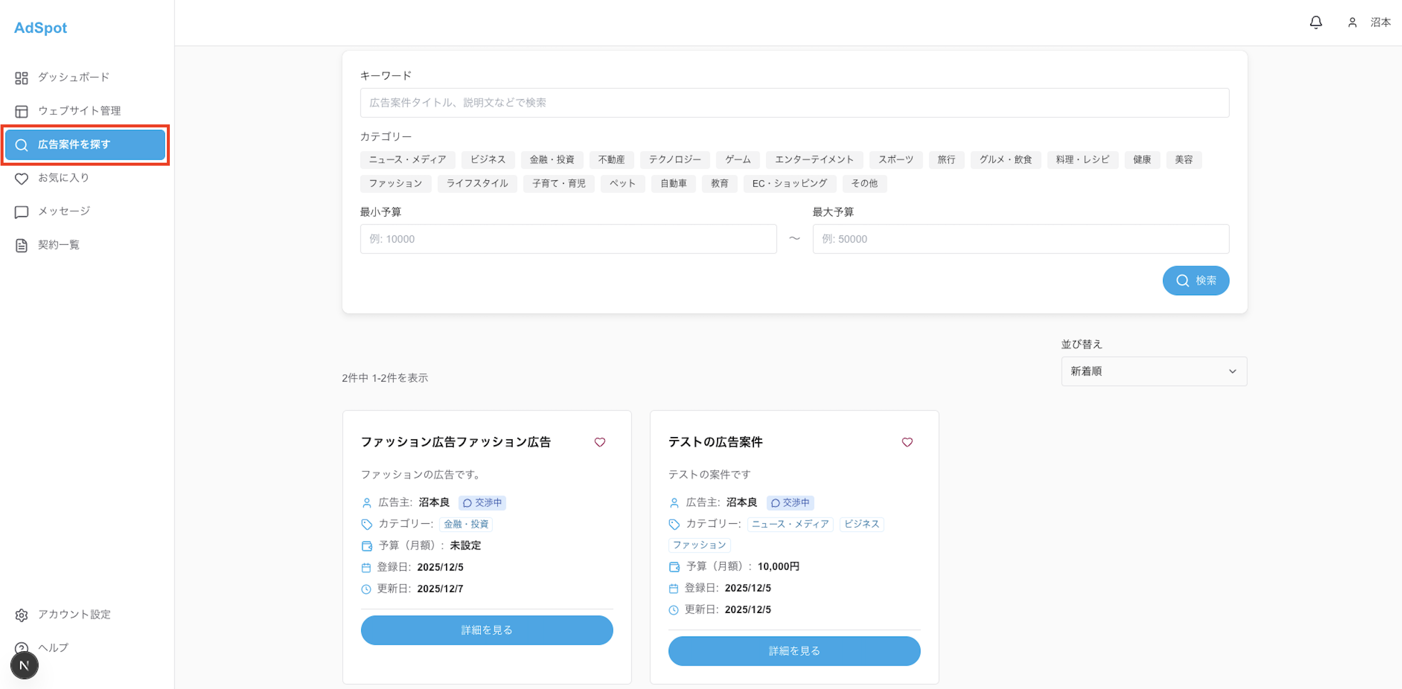 ナビゲーションメニューの「広告案件」から、広告案件を検索できます。