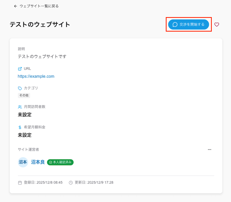 広告案件詳細ページで「交渉を開始」ボタンをクリックすると、広告主との交渉が始まります。 メッセージで、あなたのウェブサイトの魅力や掲載条件を伝えましょう。